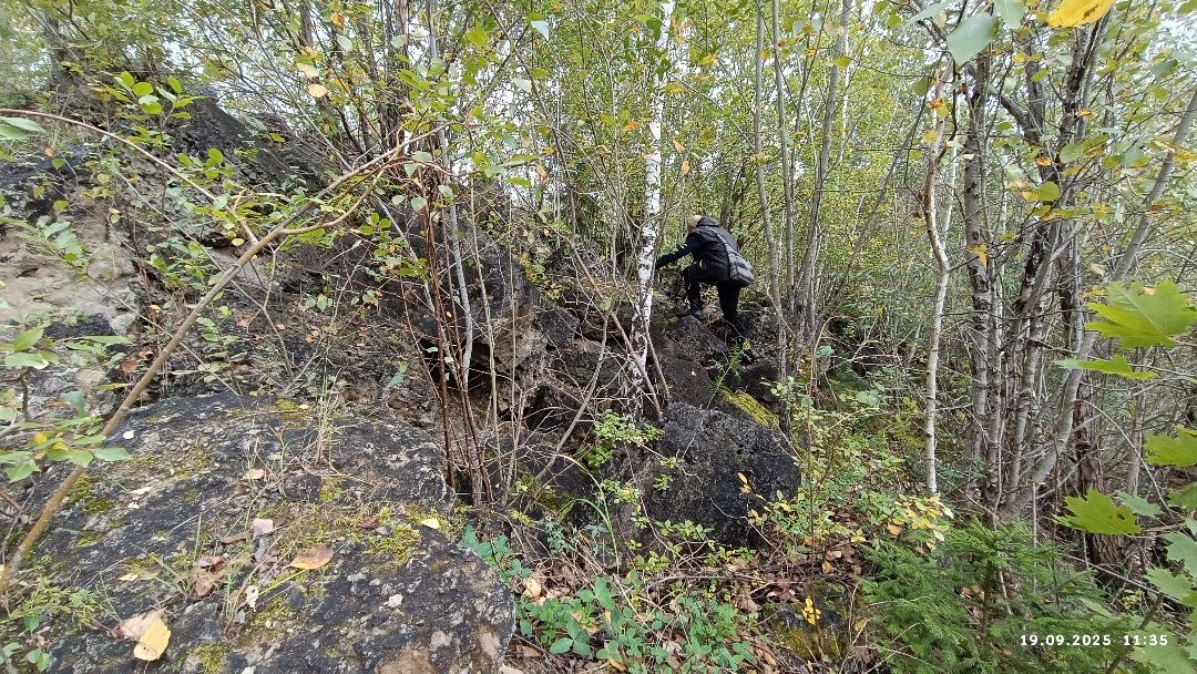 Однако затраченные усилия особых результатов не дали – заскалье помешали рассмотреть кусты. Выручает навигатор. Он успешно показывает нужное направление – к слиянию большого карьера с Двиной. Там – тупик, и придётся возвращаться назад, так пусть он станет началом осмотра карьеров.