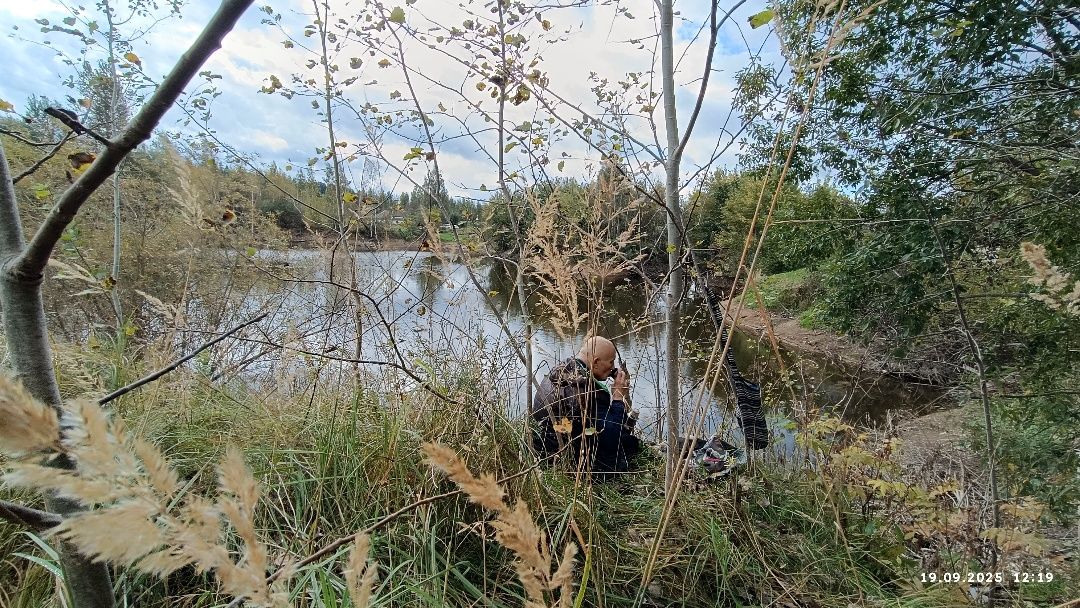 Разворачиваюсь на 180 градусов и уже копирую не речной берег, а придерживаюсь обрыва большого карьера с водой. Однако места, чтобы сфоткать весь водоём одним махом, найти за кустами не получается. Что ж, это удастся с торца его, противоположного слиянию с Двиной.