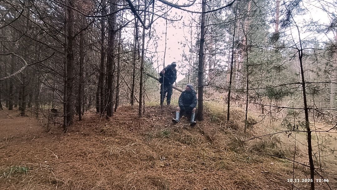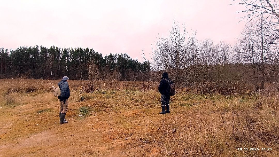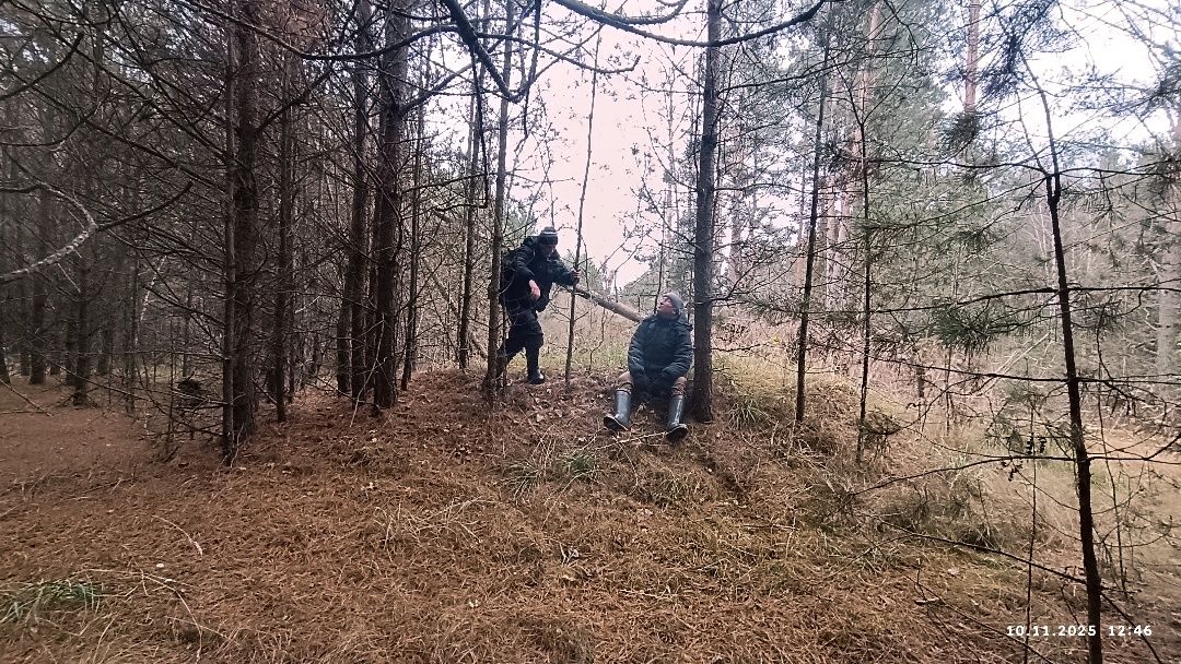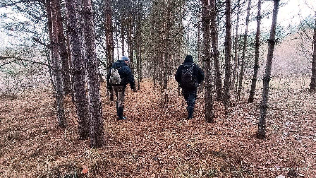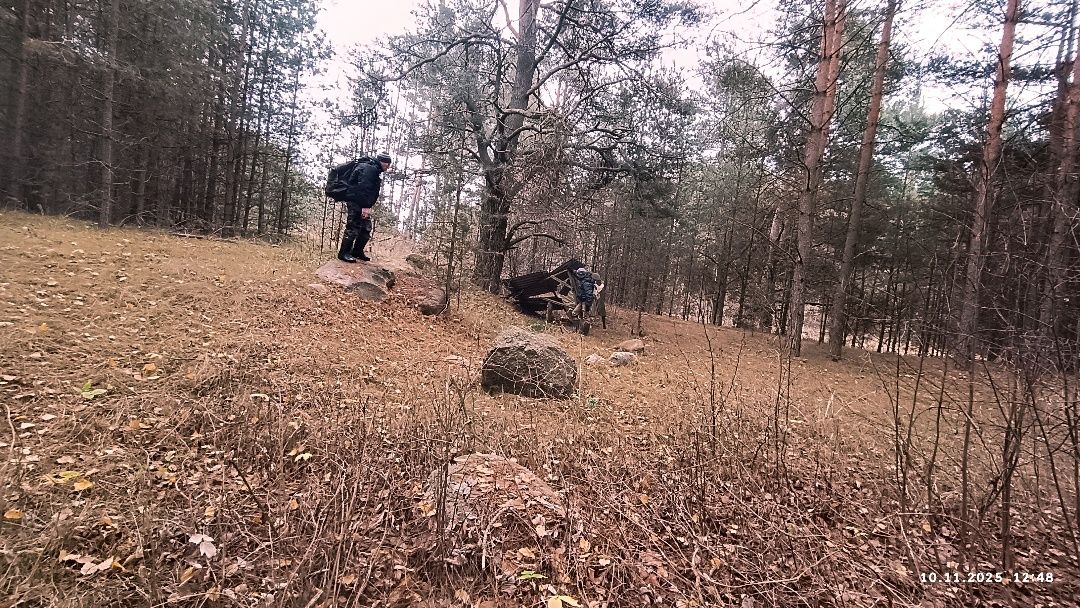 Несцерка, трэк не запісвалі. Пры другім заходзе стартанулі ад узбярэжнай альтанкі прасёлкам на стайскі асфальт. Па заканчэнні сасновага ўзлеску звярнулі перад невялікім соснікам на гары справа. Па пажухлай вялікай траве дайшлі да канавы, што цячэ з-пад асфальту, пераскочылі канаву. Ускрайкам кукурузнага поля дайшлі да сосніку злева. Прайшлі мяжой поля з соснікам. Звярнулі ў непрыкметны прагал у ім. Рушылі наўздагад соснікам у кірунку вусця канавы з-пад Вялікага Люсінца і натыкнуліся на насып са зламаным сталом наверсе. Ні ў якае параўнанне насып не йдзе са здымкам з майго рэпартажу, спасылку на які паставіў ніжэй "вовалепель" - настолькі зарос за 11 год.