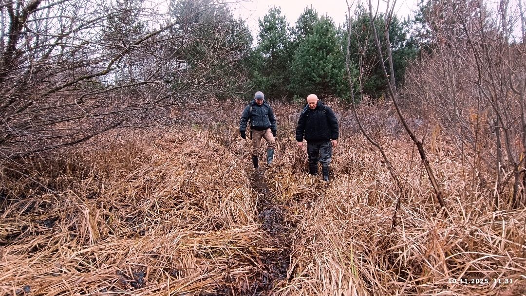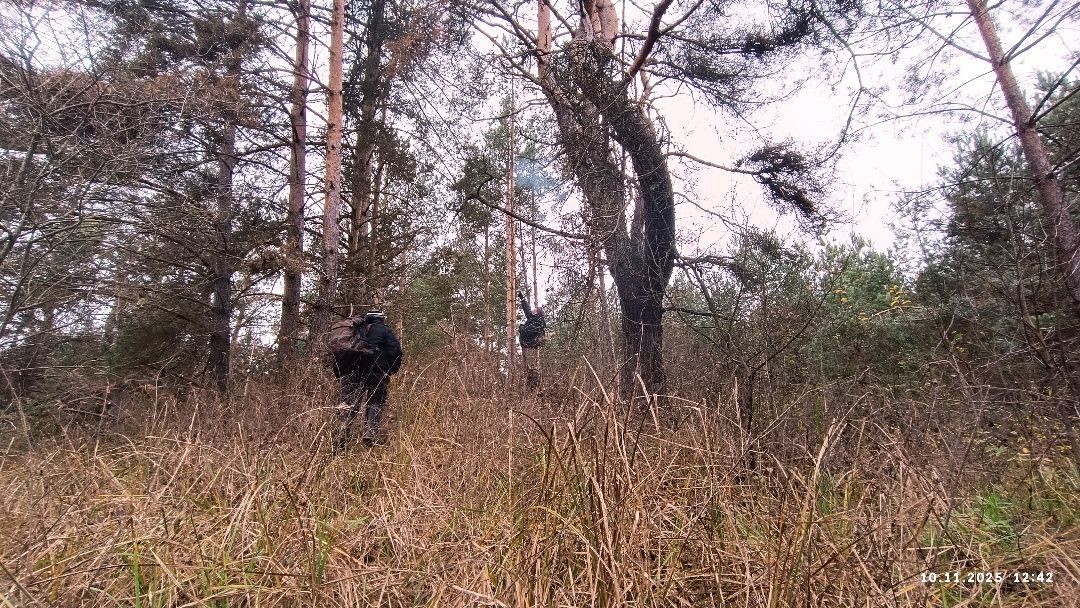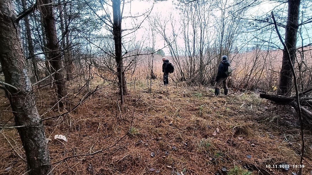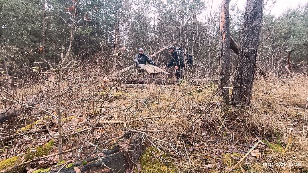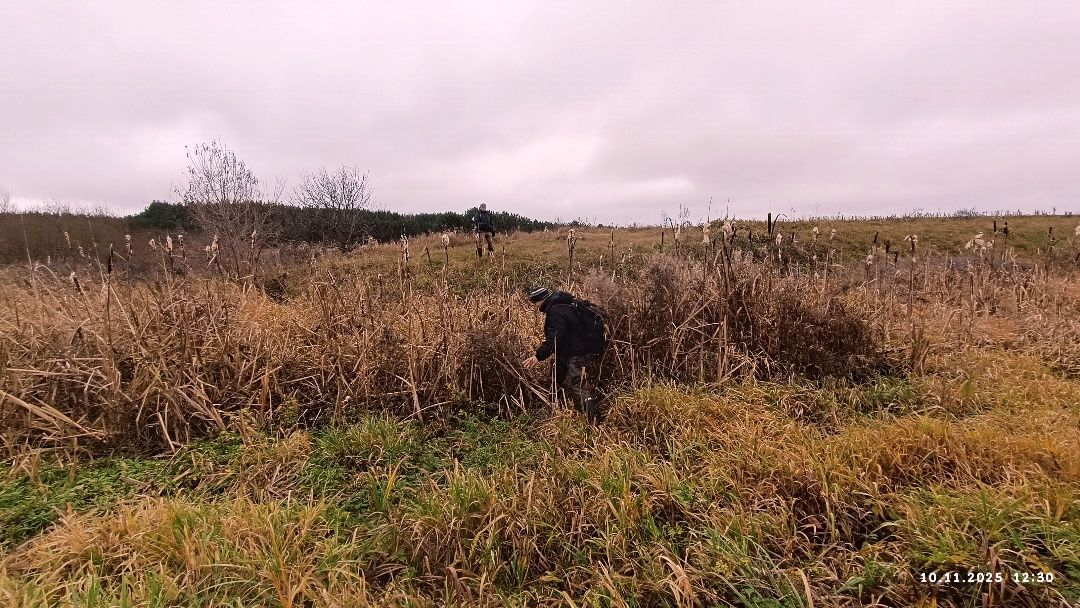 Несцерка, трэк не запісвалі. Пры другім заходзе стартанулі ад узбярэжнай альтанкі прасёлкам на стайскі асфальт. Па заканчэнні сасновага ўзлеску звярнулі перад невялікім соснікам на гары справа. Па пажухлай вялікай траве дайшлі да канавы, што цячэ з-пад асфальту, пераскочылі канаву. Ускрайкам кукурузнага поля дайшлі да сосніку злева. Прайшлі мяжой поля з соснікам. Звярнулі ў непрыкметны прагал у ім. Рушылі наўздагад соснікам у кірунку вусця канавы з-пад Вялікага Люсінца і натыкнуліся на насып са зламаным сталом наверсе. Ні ў якае параўнанне насып не йдзе са здымкам з майго рэпартажу, спасылку на які паставіў ніжэй "вовалепель" - настолькі зарос за 11 год.