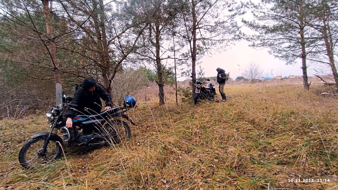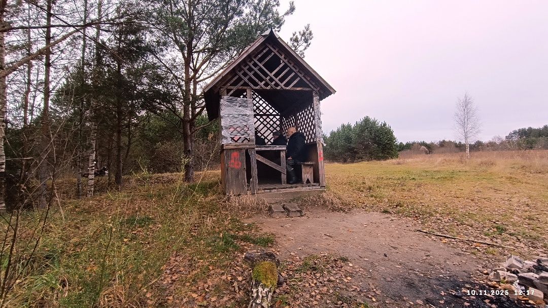 Выбравшись из затопленной поймы, решили, что надо пробираться вверх по ручью - такое направление непременно приведёт к намеченной цели. Но прибрежное болото стало забирать вправо и до того закрутило бродяг, что они заблудили. Стоят в приболотном сосняке под низвергающимся моросью мрачным небом и не знают, как вообще выбраться к исходной точке. Приходится включать навигационную карту, которую первоначально посчитали ненужной – местность казалась понятной и без навигатора. Выбираются к драндулетам быстро. Садятся в приозёрной беседке, чтобы обсудить дальнейший путь.