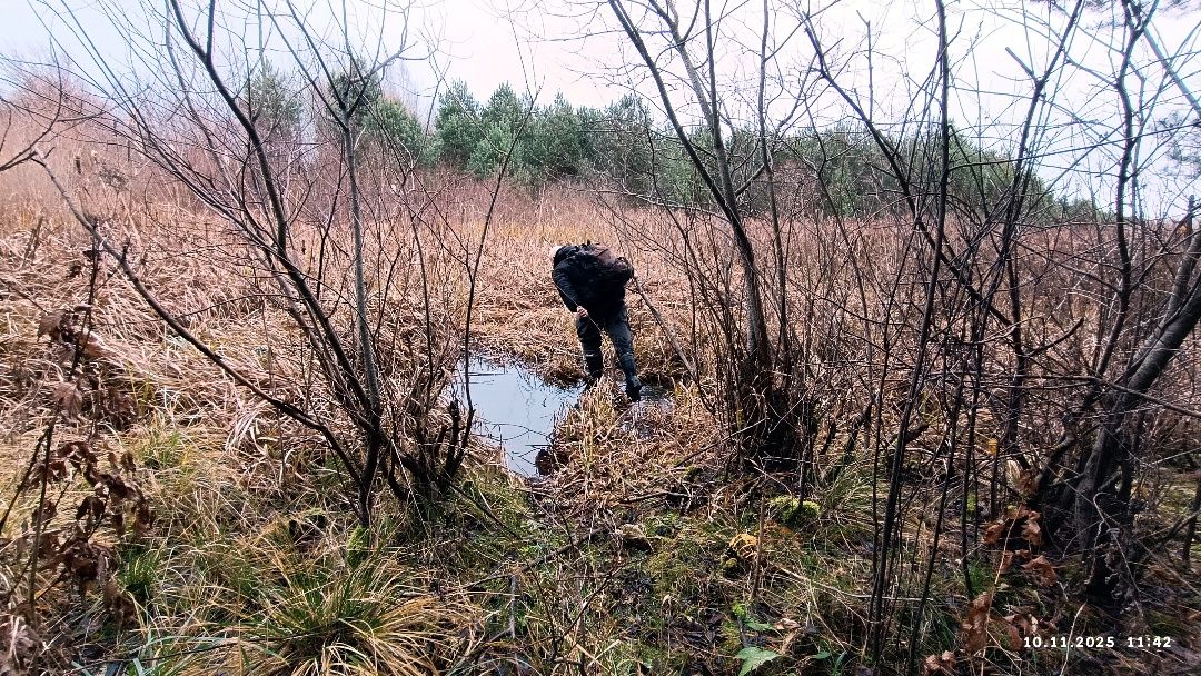 Правый берег ручья твёрдый, поросший соснами. Параллельно руслу натоптана еле заметная тропа. Вскорости сосняк заканчивается перед болотом. Очевидно, что русло повернуло под прямым углом в сторону Большого Люсинца.