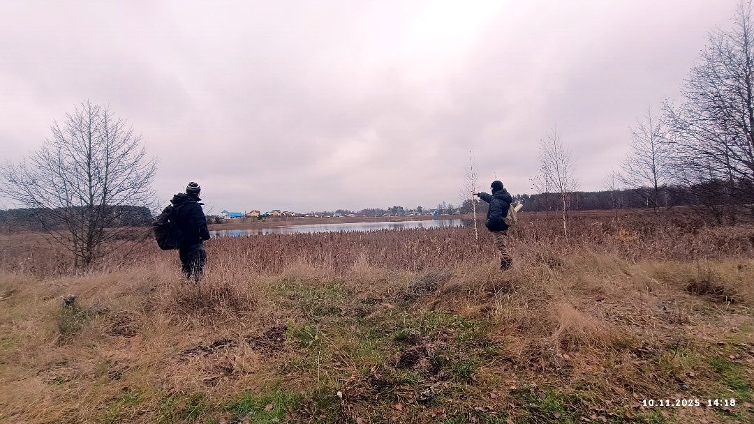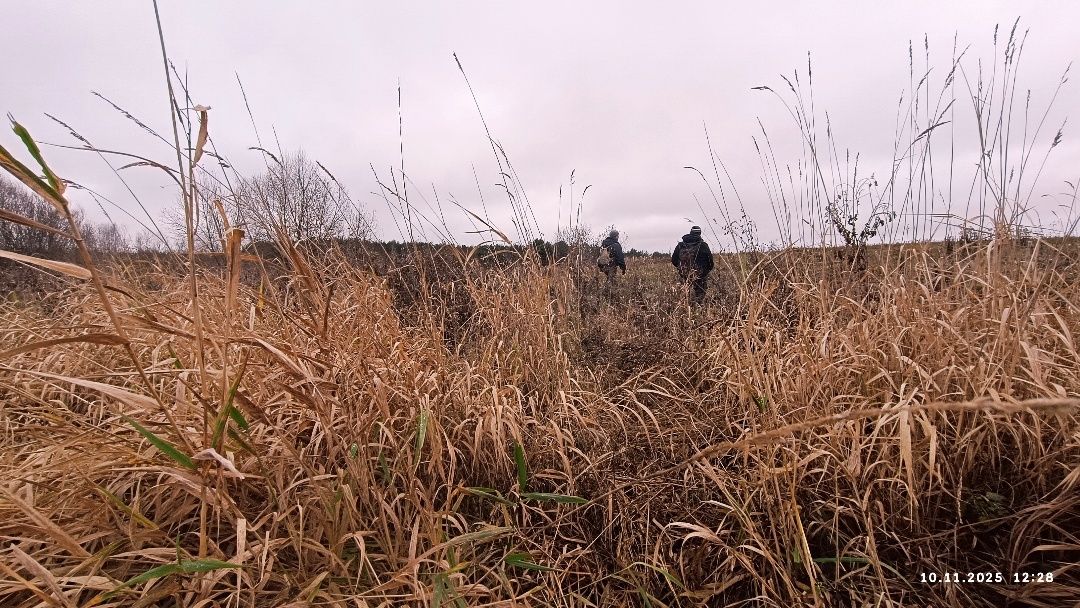 Направились к началу насыпи, т.е. в сторону Лепеля. По гребню пробираться не позволили древесные завалы и густая засохшая трава. Пошли рядышком. Через несколько десятков метров насыпь закончилась перед болотом, которое не пропустило шатунов к фрагменту железки в первую попытку прорваться к нему напрямую. На радостях от удачного завершения мытарств просалютовали строителям железной дороги сигналом охотника.