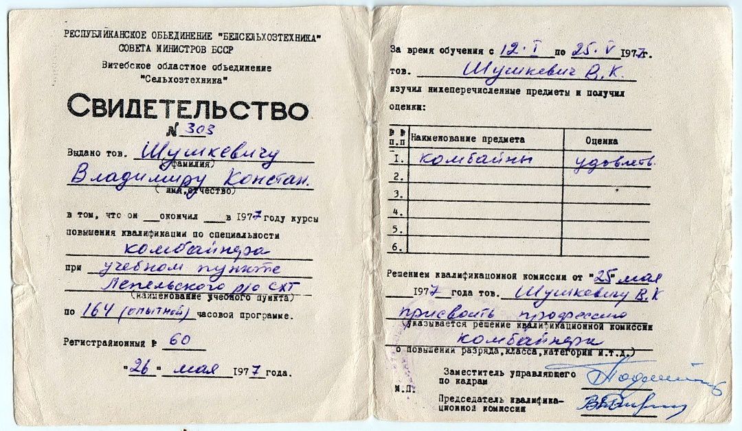 - В 1977 году районное объединение «Сельхозтехника» получило четыре новеньких зерноуборочных комбайна СК-5 «Нива» для оказания шефской помощи колхозам в уборке урожая зерновых культур. На них решили обучить и посадить восемь инженерно-технических работников предприятия. В их число попал и я. Потом все экипажи с техникой были оттранспортированы на уборку в Брагинский район Гомельской области. Мне пришлось работать на пару с механиком Витькой Садовским. Он здорово научил меня жать, а я его - «чернило» пить. В общем, за 12 дней основательно порвали нервы брагинцам. По возвращении за шефскую жатву я получил три сотни советских рублей, отчего чуть с ума не сошёл от радости – это две моих месячных зарплаты. Вдобавок прихватизировал насос из ЗИПа «Нивы». Сорок лет он верой и правдой служил моим многочисленным мотороллерам-мотоциклам, и лишь в этом году износился сальник настолько, что пришлось заменить старичка современным младенцем. А комбайновского служивого не выбросил, а поставил на вечное хранение в гараж. Уверен, что мой экспонат единственный из четырёх комбайновых насосов прожил столько и останется жить ещё некоторое время после моей смерти. Вот и считай после этой истории, вор я или честный хранитель старины. В общем, поскольку ты моложе меня, завещаю твоему музею этнографии сворованный мной с советской «Нивы» раритетный насос.
