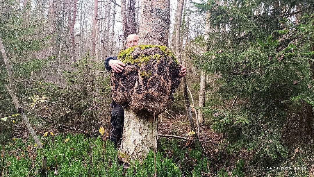 Оно ведь как получается: выбираешь-выбираешь место для лесного пиршества или под палатку для ночлега, и никак найти подходящее не получается. В отчаянии загнёшь про себя мата и расположишься лишь бы где, а потом окажется, что уютнее, милее места и быть не может. Вот и в данный момент наминаю приготовленные на костре шкварки, околицей любуюсь да твержу сам себе, что краше места в сим лесном хаосе и быть не может. Где бы ещё мог увидеть такой гигантский сувель на берёзе? Показали бы снимок, ответил бы: мистификация это, таких не бывает.