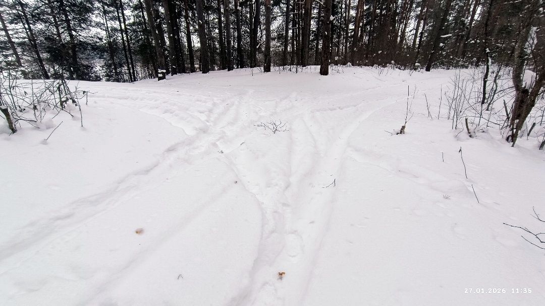 А озеро уже рядом, справа, только его пока не видно, за крутым берегом спряталось, поросшим вечнозелёными соснами. И какой-то ненормальный вездеход аж на вершину берегового склона забирался, исколесив снег при развороте.