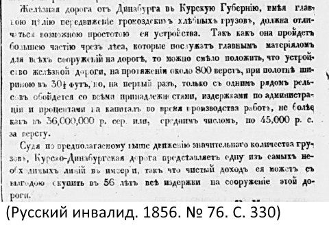 В 1856 году предлагался план строительства железнодорожной линии Рига – Динабург (Витебская губ., ныне г.Даугавпилс, Латвия) с продолжением ее в юго-восточном направлении через города Лепель (Витебская губ.), Орша (Могилевская губ.), Климовичи (Могилевская губ.), Мглин (Черниговская губ.), Трубчевск (Орловская губ.) до Курской губернии (Курска или Обояни). Магистраль должна была пересечься со строящейся Петербурго-Варшавской железной дорогой. По мнению инженера-подполковника путей сообщения К.Марченко, выдвинувшего идею строительства Курско-Динабургской линии, дорога «пройдет большей частию по ровной местности. Это направление, сравнительно с другими направлениями, представляет значительные удобства для ея устройства». Инициатор создания нового железнодорожного маршрута предполагал, что государство будет иметь от этого сообщения огромную экономическую выгоду, главным образом потому, что обеспечится быстрая доставка хлеба из плодородных черноземных регионов в западные губернии и к балтийским портам (Русский инвалид. 1856. № 76. С. 329–330).