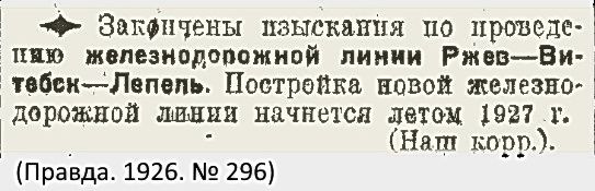 К идее провести железную дорогу от станции Сычевка Смоленской губернии через Витебск до Лепеля вернулись после постройки в 1925 году Оршанско-Лепельского участка. В сентябре 1926 года газеты писали, что начато строительство железной дороги Сычевка – Витебск – Лепель (Красная звезда. 1926. № 189. С. 1).